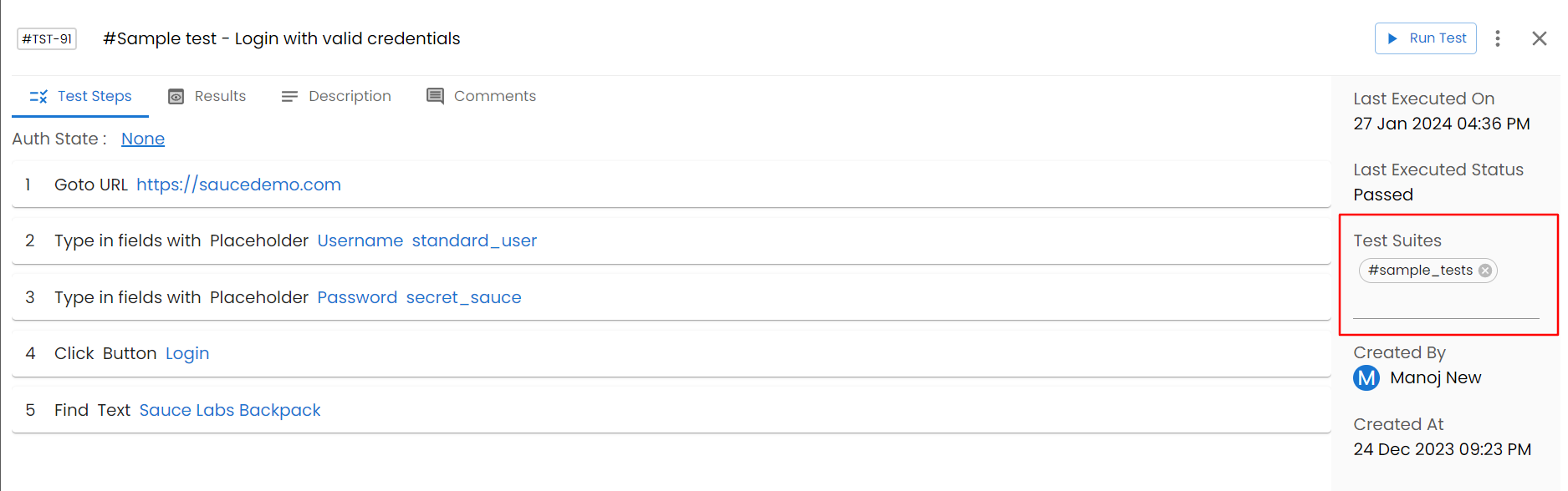 Test cases can be grouped under test suites according to their structure. For example, If you have test cases for Login functionality, you can create a test suite called "Login" and add all the test cases related to the login functionality under the suite and execute the suite. This helps when testing a specific functionality alone.&#x20;